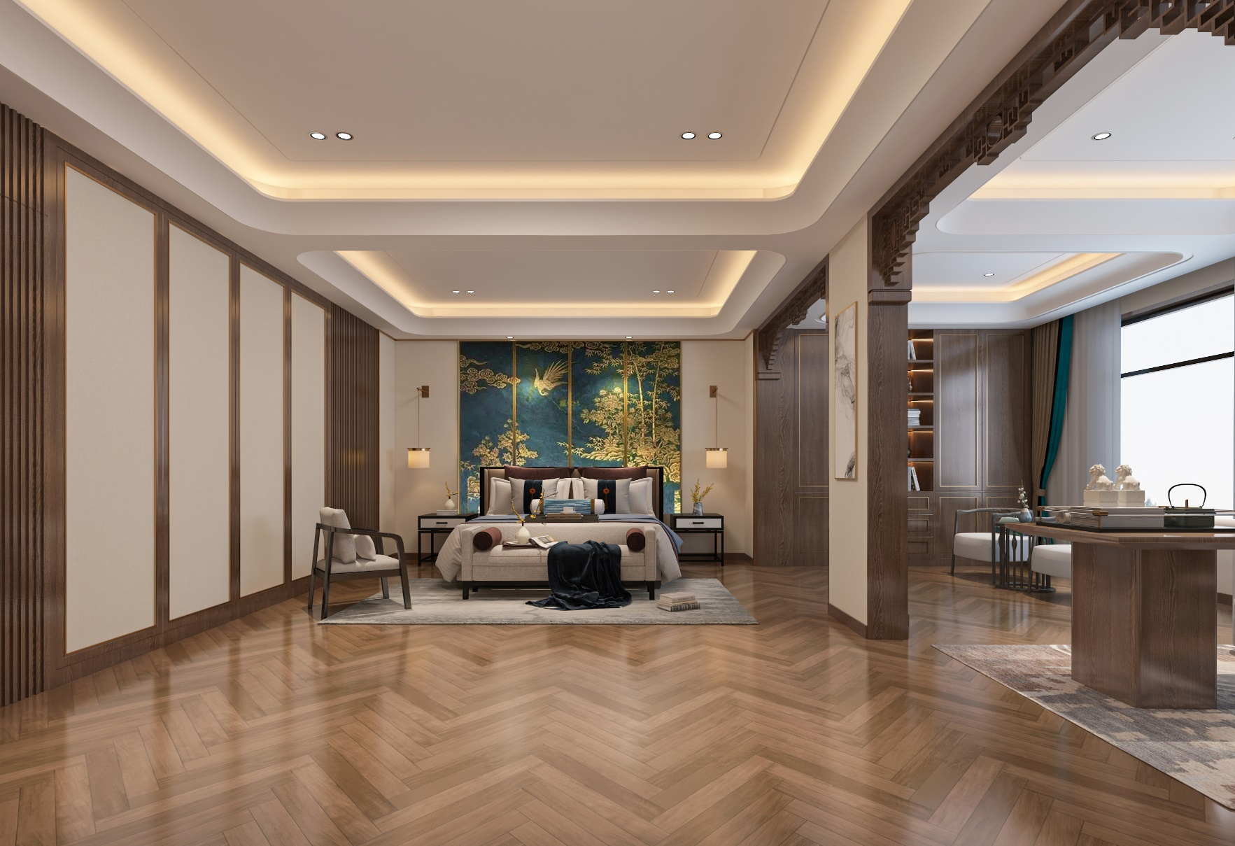 返璞歸真便是中式臥室的真諦,鎏金的風(fēng)景畫靜靜地停留在深藍(lán)的頁面上,床頭柜、紡布燈飾、木色調(diào)賦予了空間韻味流轉(zhuǎn)的“本能”。