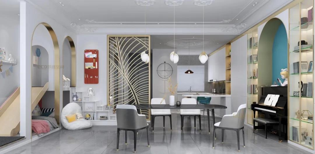 開放的空間格局,每一個(gè)空間都恰到好處,大大的落地窗引入暖暖的陽光,加長的餐桌島臺,一家人在這里吃飯,喝茶,暢聊,精致的生活情愫于曼妙的光影間流淌,“家”的溫度盡情濃縮于此。