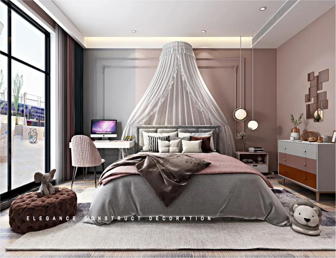 粉色的空間傳達(dá)出小女孩可愛甜蜜的信號,低飽和度的色彩充滿神秘與優(yōu)雅,夢幻的紗幔和布藝窗簾,將整個(gè)空間的色彩基調(diào)呈現(xiàn),絲柔表面,柔軟的床品滿是香甜,既豐潤了空間的層次,又滿足了女孩的公主夢。