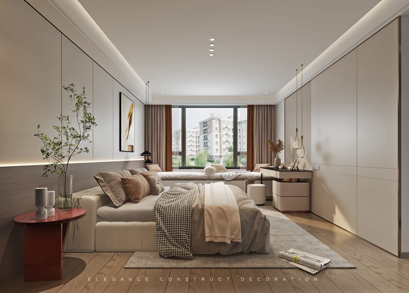 在柔和的線條中趨于平靜,藝術(shù)涂料,膚感板,布藝的使用柔化了空間的表情,讓人倍感放松。