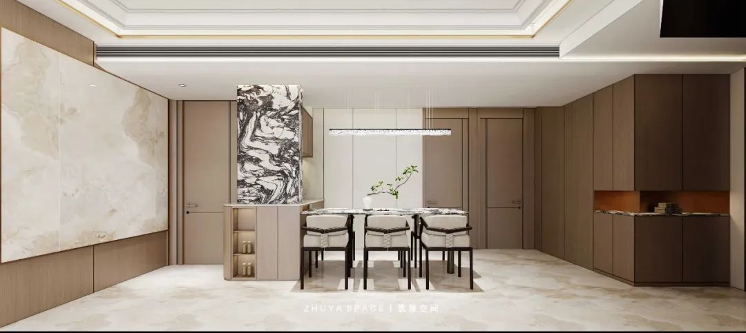 餐廳部分采用經(jīng)典木色與理石搭配帶來更豐富的視覺層次,整體線條簡潔、結構豐富簡潔美觀的同時又突顯居者品味不凡的氣質